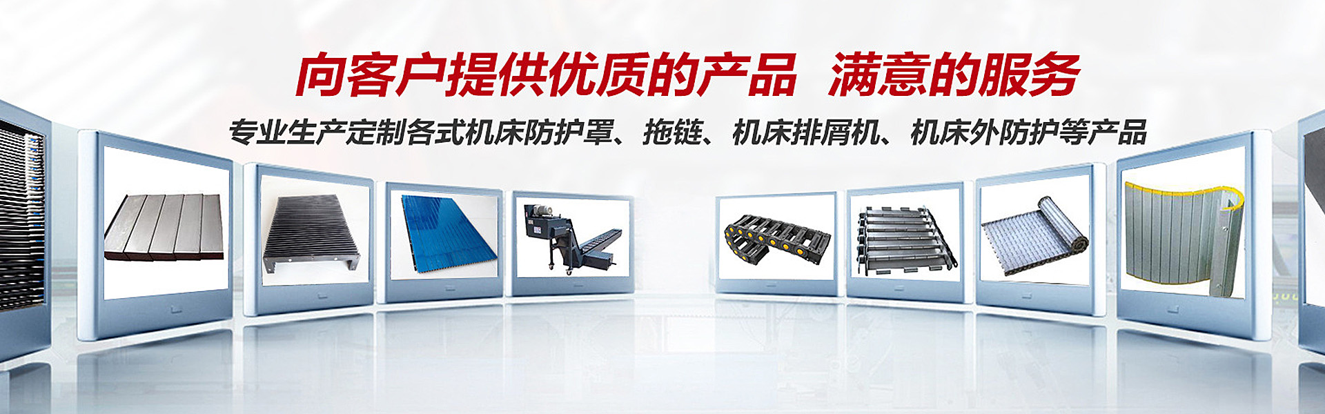 主要產(chǎn)品有:鋼板伸縮式防護(hù)罩、新型pvc柔性護(hù)罩、風(fēng)琴式、圓桶式、鎧甲式、卷簾式伸縮護(hù)罩、鋁形防護(hù)簾、TL橋式鋼鋁拖鏈、橋式全封閉式工程塑料拖 鏈、矩形金屬軟管護(hù)套、DGT導(dǎo)管護(hù)套、螺旋鋼帶護(hù)套、機(jī)床導(dǎo)軌刮屑板、T型撞塊槽板、可調(diào)塑料冷卻管、S78系列機(jī)床墊鐵等。